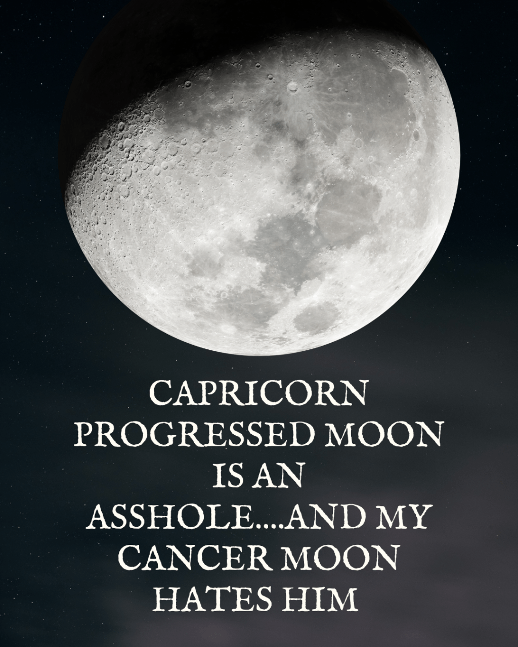 I did some deeper research in my chart and found I had a Capricorn progressed Moon. Essentially this means that im learning better control my emotions but with a natal Cancer Moon this causes tension and issues. I am working at this time on my boundaries with people especially in feelings and attachments. But with the opposition of my natal Cancer Moon and my progressed Capricorn Moon that just started recently this year this is going to be a difficult year for me emotionally. Cancer wants to care nurture and FEEL everything and Capricorn wants to structure it, contain it in some way, and “make it make sense” in a practical way.
